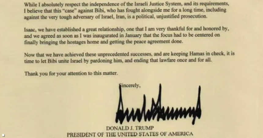 وجاء في رسالة ترامب أن “العفو عن نتنياهو سيكون خطوة مهمة لتوحيد إسرائيل بعد سنوات صعبة”. وأكد ترامب في الرسالة أن نتنياهو “دافع بثبات عن إسرائيل في مواجهة خصوم أقوياء، وأن القضية المرفوعة ضده سياسية وغير مبررة”.