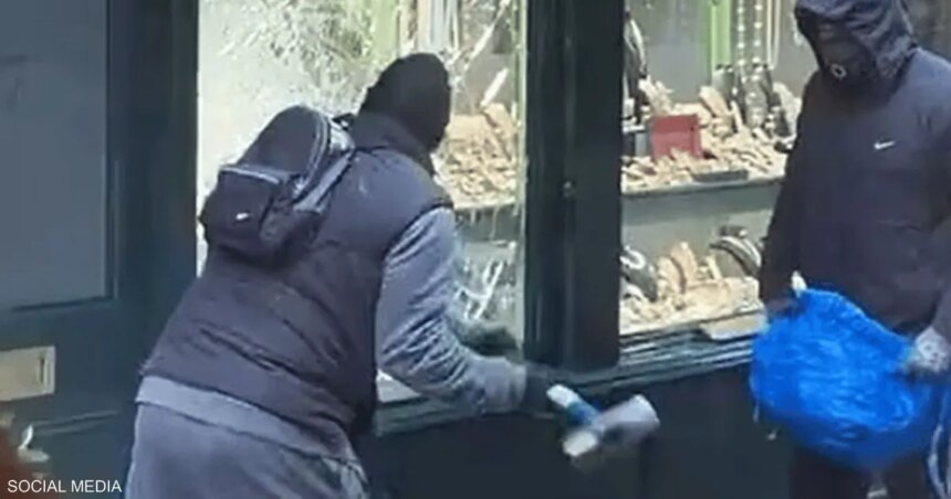 وظهر في الفيديو رجلان ملثمان يرتديان أغطية رأس، استخدما مطرقة لتحطيم واجهة متجر مجوهرات “غريغوري وشركاه” في ريتشموند، قبل أن يقوما بنزع الزجاج المحطم.