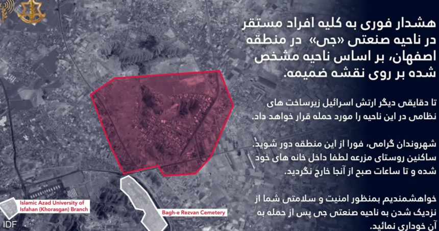 وطالب الجيش في بيان أرفقه بخرائط توضيحية، المواطنين الإيرانيين المتواجدين في المجمع بضرورة الإخلاء والابتعاد عن الموقع فورا، مؤكدا أن العمليات الوشيكة ستتركز على بنى تحتية عسكرية.