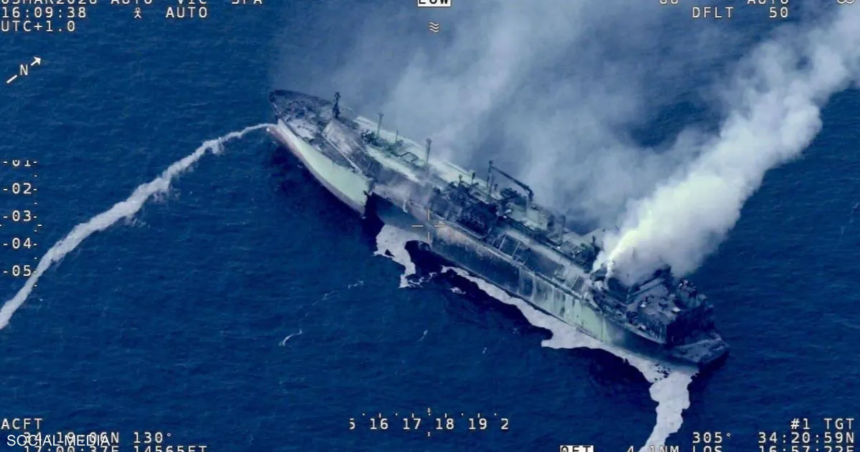 وأفادت المصلحة، عبر صفحتها على فيسبوك، الأربعاء، بأن مركز البحث والإنقاذ الليبي تلقى نداء استغاثة من الناقلة يفيد بتعرضها لانفجارات مفاجئة أعقبها حريق هائل أدى في النهاية إلى غرقها بالكامل.