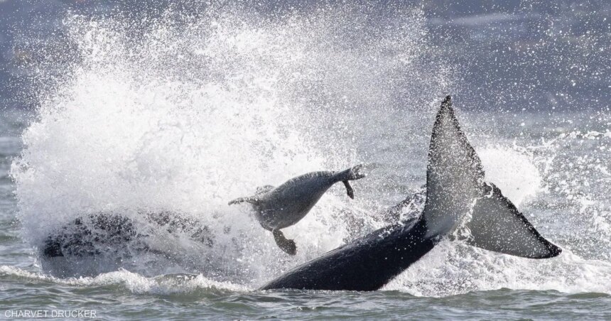 وخلال رحلة لمشاهدة الحيتان في مياه سياتل غربي الولايات المتحدة، التقطت المصورة تشارفيت دراكر مقطع فيديو لسرب من الحيتان وهي تصطاد فقمة، لم تنج إلا بالتسلق إلى قاربها.