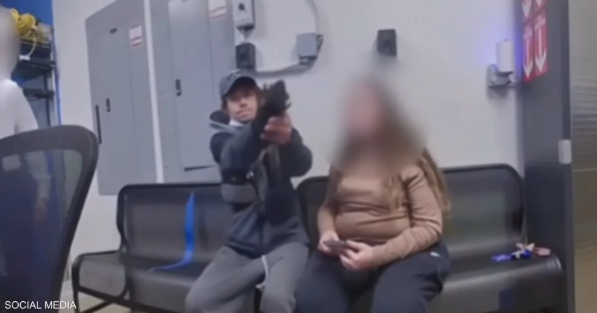 وسمع في الفيديو صوت “نقرة” صادرة عن السلاح مرتين، مما يشير إلى تعطل المسدس وفشله في إطلاق الرصاص. وفي تلك اللحظة، تدخل موظف أمن في المتجر محاولا شل حركة المشتبه به، مما أتاح للضابط السيطرة على الموقف وتثبيت الشاب على الأرض حتى وصول التعزيزات.