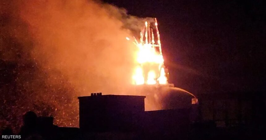 وبدأت النيران بعد منتصف الليل مباشرة، مما أدى إلى انهيار برج الكنيسة التي يعود تاريخ بنائها إلى عام 1872.