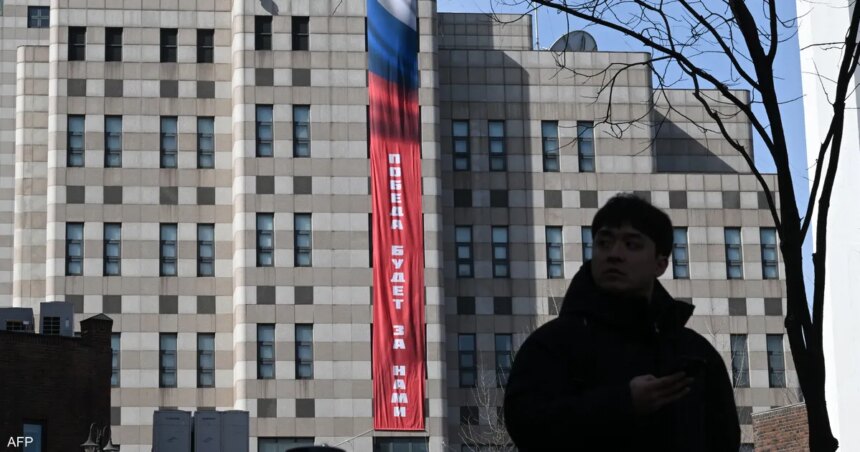 وشوهدت اللافتة الحمراء والبيضاء والزرقاء والمكتوبة باللغة الروسية خلال عطلة نهاية الأسبوع، وكانت معلقة في السفارة حتى صباح الإثنين، حسبما أفاد مراسل “فرانس برس”.