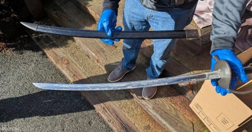 وخلال عملية التفتيش، عثرت الشرطة على العديد من الأسلحة البيضاء في منزله، منها منجل وسكاكين وسيوف.