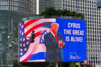 ويظهر في اللافتات الرئيس الأميركي دونالد ترامب، ووزير…